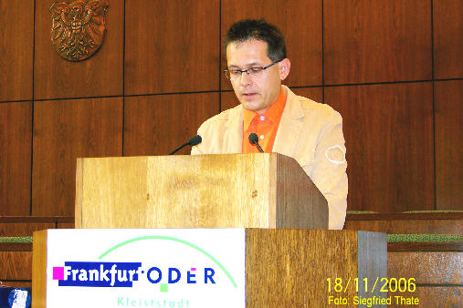Bild 05 Olaf Gardt (Leiter Lokalredaktion MOZ Ffo), der auch in der Jury mitwirkte, hält die Laudatio auf den 2.Preisträger: Die 16jährige Alexandra Zens